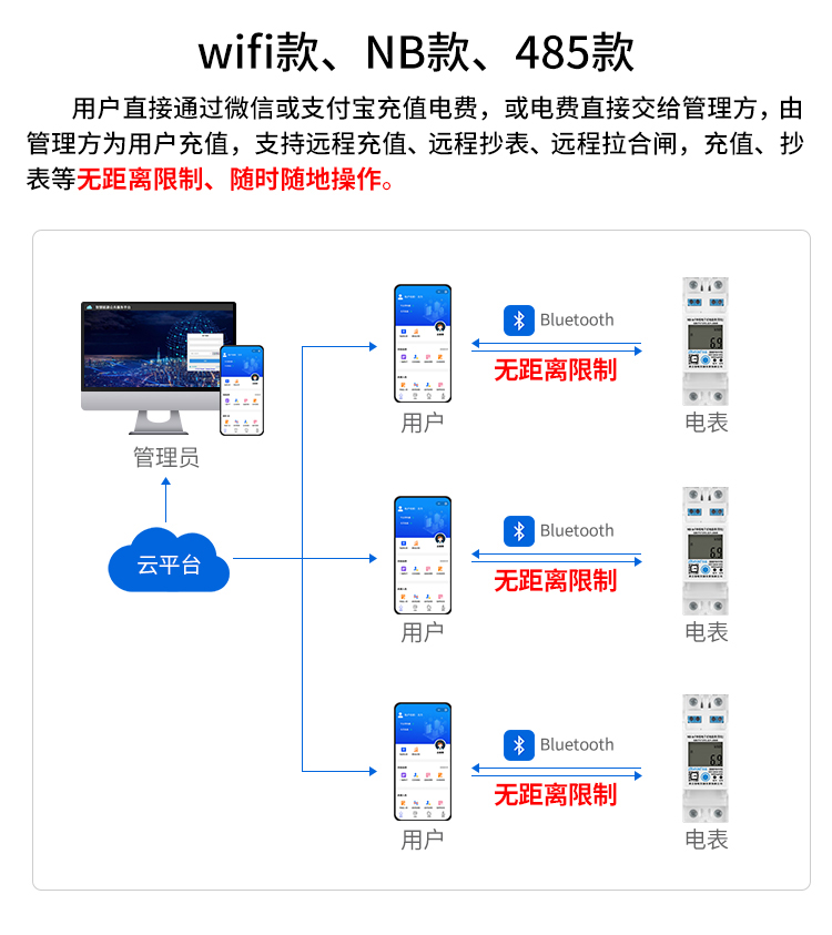 本公司DDSY6111/DDZY6111遠(yuǎn)程智能電表與本公司遠(yuǎn)程抄表系統(tǒng)和手機(jī)APP配套使用,遠(yuǎn)程抄表管理系統(tǒng)具有實(shí)時抄表、定時抄表外,還提供了設(shè)備管理功能,如告警、余額短信通知、遠(yuǎn)程充值、手機(jī)抄表、手機(jī)查詢、手機(jī)充值、預(yù)付費(fèi)、后付費(fèi)、自助充值機(jī)充值、遠(yuǎn)程拉合閘、各種查詢報表、統(tǒng)計報表下載等功能。