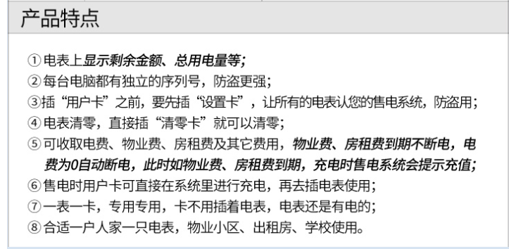 主要特點:應(yīng)用計算機(jī)管理,先購電后用電;在額定電流范圍內(nèi)能限制使用功率(由供電部門限定);一表一卡,??▽S茫Эú皇щ?,補(bǔ)卡再用;電卡能雙向傳遞數(shù)據(jù),能自動斷電告警用戶購電;電量為零時,自動拉閘斷電;并具有一定的防竊電軟件設(shè)計等。