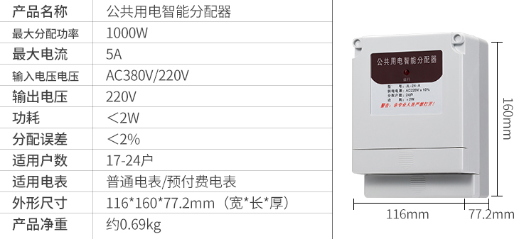 一、智盛牌JL-24-A公共用電智能分配器”是將公共樓道用電所消耗的電能(如樓道燈,對講防盜門等),自動分配到各受益用戶的電表中。每天輪流接通一戶電表,開機通電時第一戶電表隨機產生,達到公平分攤電費的目的。