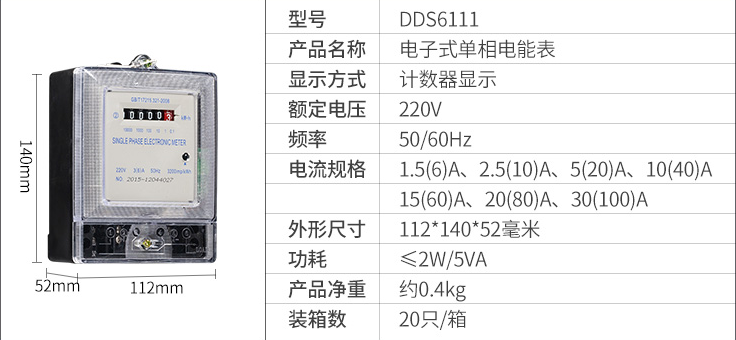 DDS6111型單相電子式電能表,由于采用集成電路和SMT制造工藝,使之測量準(zhǔn)確度,穩(wěn)定性等均得到了可靠保證.適用計量額定頻率為50Hz,額定電壓為220V的單相交流有功電能.