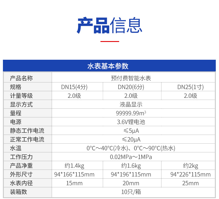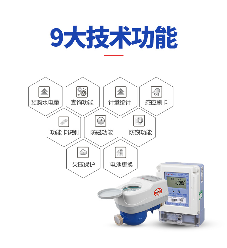 1、概述預(yù)付費(fèi)水表是以旋翼式水表為基表,由干簧管取信裝置、低功耗電控閥門、微電腦控制系統(tǒng)、射頻卡信息系統(tǒng)集合而成的智能水表。該產(chǎn)品改變了傳統(tǒng)的用水收費(fèi)方 式,由“先用水后交費(fèi)”變?yōu)椤跋冉毁M(fèi)后用水”, 每次售水收款都有記錄,解決了“收費(fèi)難、賬目亂”這兩個水費(fèi)管理工作中的難題。有遠(yuǎn)傳抄表功能的預(yù) 付費(fèi)水表還可實時統(tǒng)計用水?dāng)?shù)量,為水費(fèi)結(jié)算提供依據(jù)。產(chǎn)品符合國家標(biāo)準(zhǔn)GB/T778-2007《封閉滿管道中水流量的測量、飲用冷水水表和熱水水表》的全部技術(shù)要求。